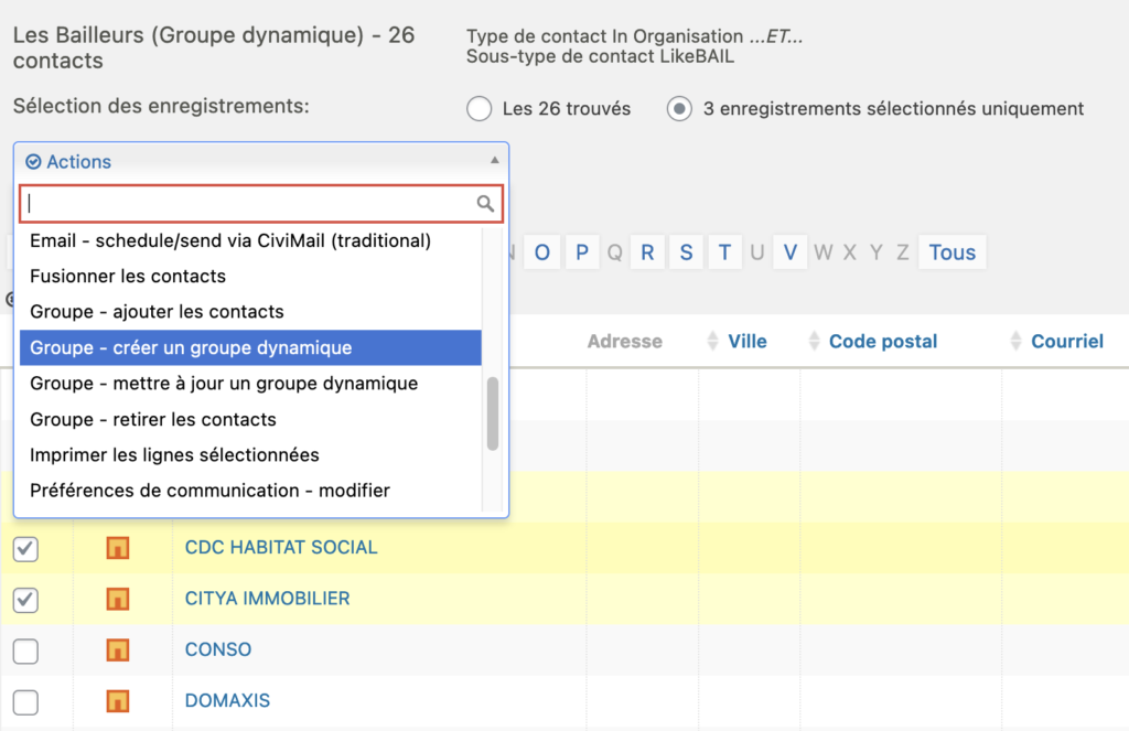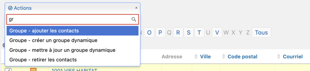 Les listes de résultats de recherches permettent, en sélectionnant tout ou partie, de faire un certain nombre d’actions en lien avec les relations, les activités, les contacts, les courriels, les groupes, les étiquettes, les étiquettes postales et les événements (comme les Formations syndicales) :