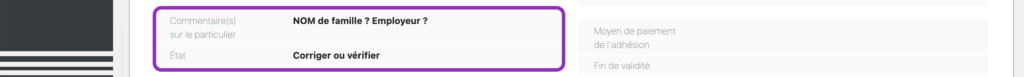 La page de résultats affiche les champs : Nom, Moyen de paiement de l’adhésion, Fin de validité et Commentaire.