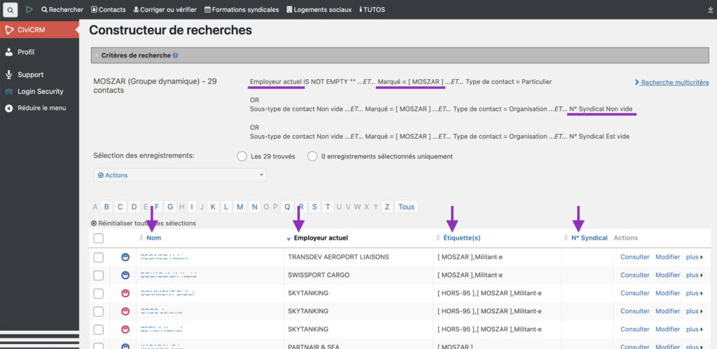 La page de résultats affiche les champs : Nom, Employeur actuel, Étiquette(s) et N° Syndical.