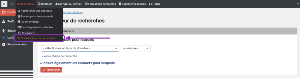 Accessible depuis le menu Constructeur de recherches, il permet de construire des recherches personnalisées.