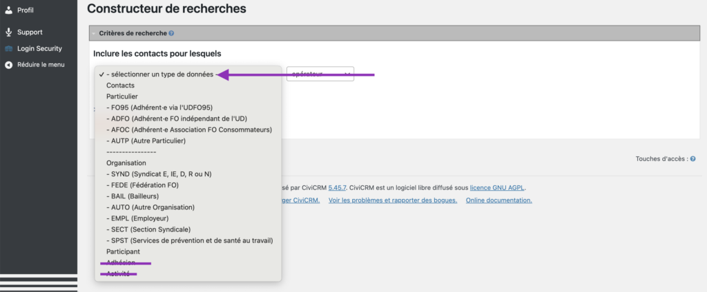 Le second champ – Type – est une liste déroulante de tous les types de contacts (on ne peut en sélectionner qu’un seul à la fois).