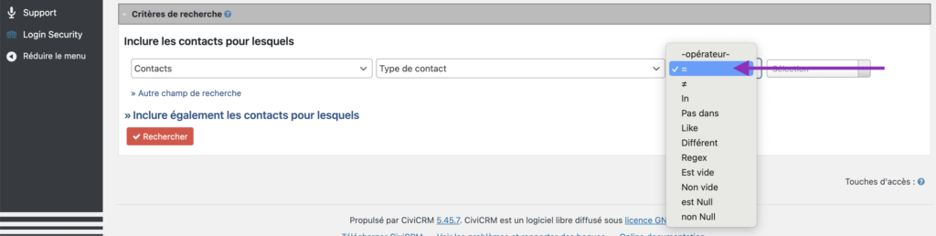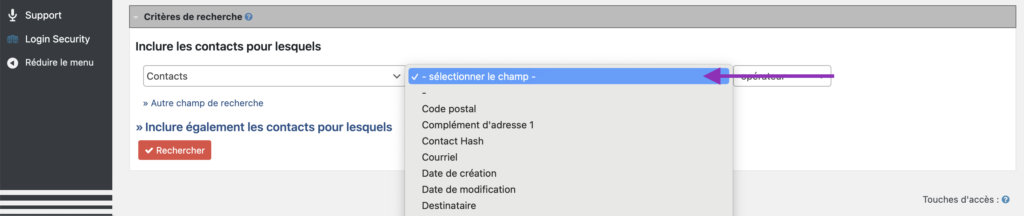 Le premier champ – Inclure les contacts pour lesquels – permet de cibler la recherche sur les critères suivants.
