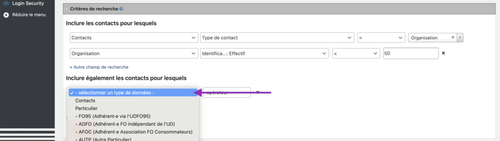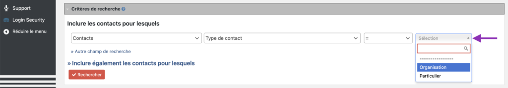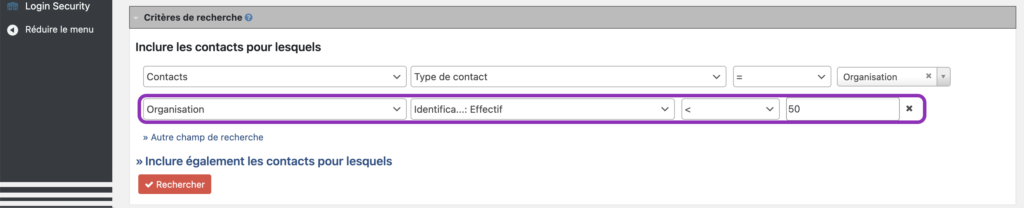 Inclure également les contacts pour lesquels permet d’ajouter des nouvelles lignes de champs pour ÉLARGIR la recherche.