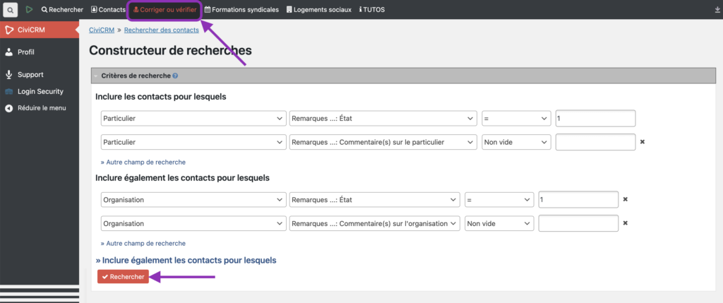 La recherche affiche tous les contacts dont le champ « Commentaire… » présente un « État » à Corriger ou vérifier.