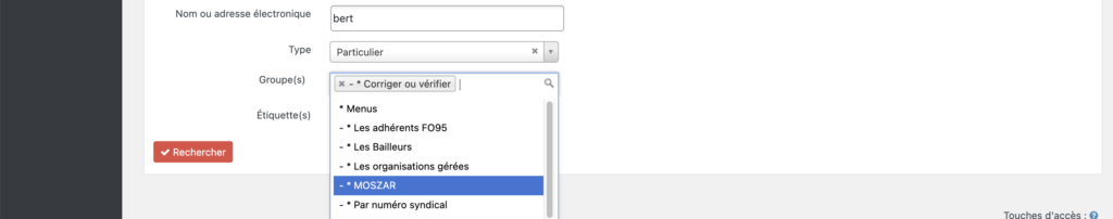 Le troisième champs – Groupe(s) – permet de combiner les autres recherche avec un ou des groupes préenregistrés.