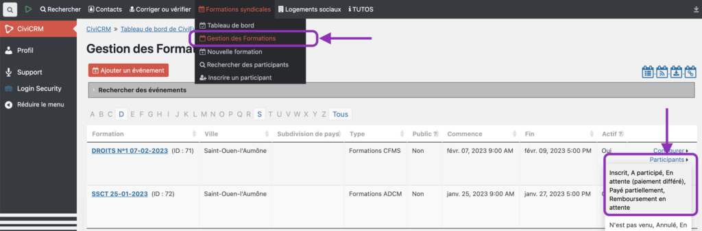 À partir de la Gestion des Formations, grâce au lien Participants qui affiche la liste des participants à cette formation.