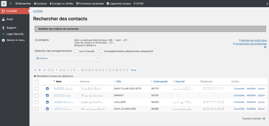 Cette recherche affiche les champs standards de base : Nom, Adresse, Ville, Code postal, Courriel et Téléphone
